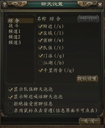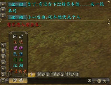 在游戏中可以通过聊天系统认识更多的朋友,通过不同的聊天频道让大家交流起来更轻松、更方便。 聊天频道 聊天频道分为综合、战斗和三个自定义频道。综合频道会出现所有聊天信息,战斗频道仅出现战斗信息,自定义频道可根据定义的内容显示聊天信息(左侧聊天设定按钮进行设定)。 聊天范围 分为附近、区域、密聊、队伍、门派、江湖和千里传音。用江湖和千里传音时是需要消耗相应道具的。 表情 游戏为玩家们提供了3页的丰富表情,点击你想要发送的表情,即会出现在聊天框中,运用适当的表情可以更好的表达你的想法。 动作 选择聊天频道最后一个小人图标,可以弹出相应的动作系统界面,一共有13种,分别是:鞠躬、作揖、鄙视、哭泣、胜利、挑衅、愤怒、加油、下跪、坐下、大笑、睡觉、飞吻。 [所有资料均以线上游戏内数据为准] |