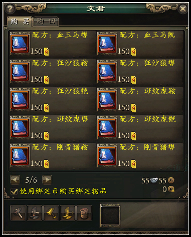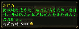 若各位玩家需给其他坐骑“狼”、“熊”、“鹿”、“虎”、“猪”装备坐骑道具时,则需要一件“马装部件成品”与【麒麟石】至姑苏城特定NPC【八卦天符商人-文君】处购买特定配方进行转换(每件坐骑装备转换只能进行一次,无法进行二次转换。)