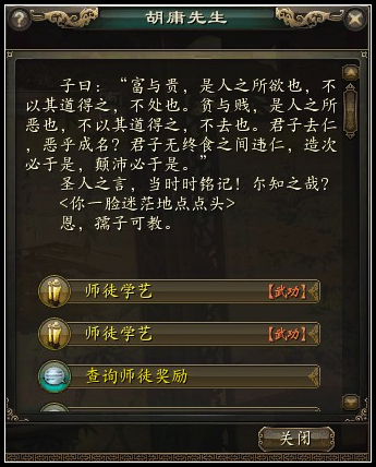 每成功完成一个任务,师傅可获得一定授业点数,金钱奖励。