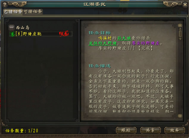 按下快捷键L,弹出任务界面,任务目标中绿色下划线点击后,可自动寻路至目标处。同时我们可以跟踪,共享或放弃选定任务。可接任务表明你还有其它任务未接。