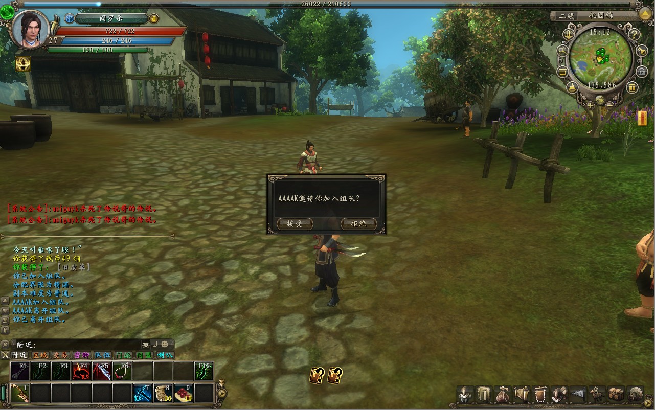 玩家接到组队邀请。加入队伍后,角色头像上的旗帜标志表示队长。 队长头像下拉菜单可以决定分配方式、拾取方式等。